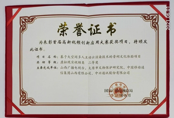 同时,中兴通讯联合山西广播电视台、太原市文物保护研究院、山西移动打造的晋祠文化体验项目荣获虚拟现实视频类二等奖。该项目基于中兴通讯ZTEXRExplore平台的大空间多人互动云渲染技术,将云渲染和大空间动作捕捉进行了有机融合和端到端优化,实现了业界首个VR文旅多人互动剧场应用。游客只需穿戴轻便的头盔和动作捕捉装置,就能实现以自主选择的虚拟形象在1:1还原的高精度晋祠VR场景中自由漫步,且多个体验者在虚拟场景中互相可见,可协作交互触发场景和剧情,真正沉浸在晋祠的三千年文化之旅中。