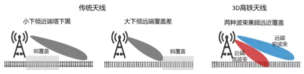 传统高铁天线垂直面波宽为固定值,方位角确定后,只能通过调节下倾角来优化覆盖,无法兼顾线路上的远端和近端区域,导致高铁线路出现覆盖问题。华为3D高铁智能覆盖天线通过权值+每端口设置独立下倾角的方式,形成独特的水平面波束,同时填充了垂直面下副瓣零点,从而达到远端窄波束和近端宽波束兼顾远近区域覆盖的效果。