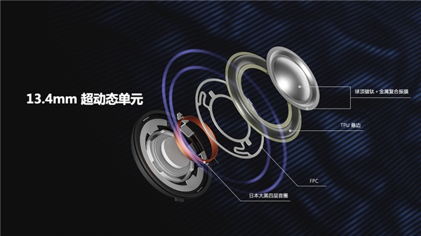 13.4mm大直径超动态声学单元,超低失真性能,还原临场魅力。单元采用“TPU+金属复合振膜”三层式振膜结构,柔软的 TPU 材质带来扎实的低音,复合振膜轻松驾驭饱满人声与纷呈细节,精密声学设计带来宽阔声场与透澈均衡的听感,轻松驾驭不同曲风。