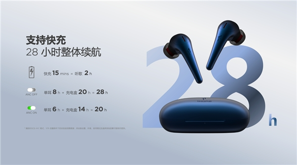 充分考虑出行的续航需求,高效能电池带来持久电量:单耳满电8小时播放,整体续航可达28小时(降噪关);单耳满电6小时播放,整体续航20小时(降噪开),一周通勤无需充电,马拉松和国际航旅也无需担忧中途断电。支持快充,快充15分钟,可听歌2小时,一杯咖啡或是化妆洗漱的时间,就能让音乐继续播放。