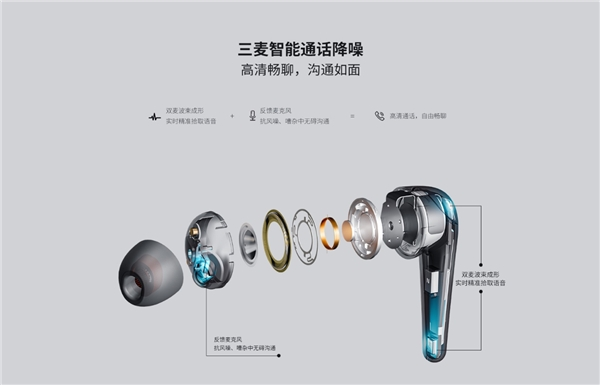 左、右耳机各搭载三枚麦克风,融合高精度智能算法,可自适应消除环境噪声多达 30dB。双反馈麦波束赋形阵列,实时精准拾取语音;通话麦克风可优化音色、抗风噪。相比双麦通话降噪,即使在嘈杂、风噪干扰的环境下,轻声细语也能让对方听得更清晰、真实。