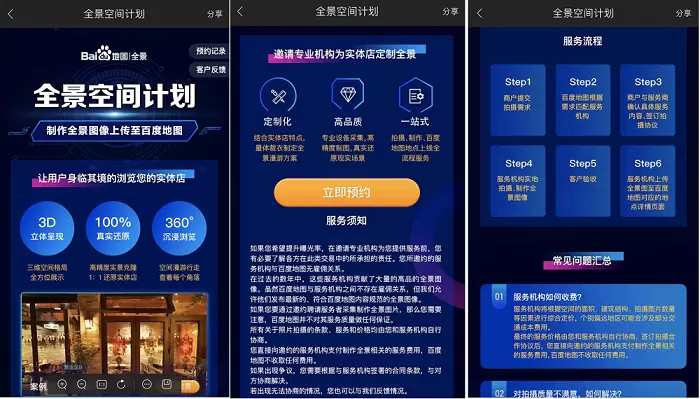 全景空间导览的制作是技术活,但商家无需操心。百度地图“全景空间计划”提供定制化、高品质的一站式服务,商家只需通过百度地图App搜索“全景空间”,或访问“百度地图全景平台”中的“全景邀拍”一栏,即可进行预约操作。从实体店街景拍摄,到360°沉浸式的内部全景导览制作,再到全景空间上线地图,都可通过百度地图获得“托管”式服务。