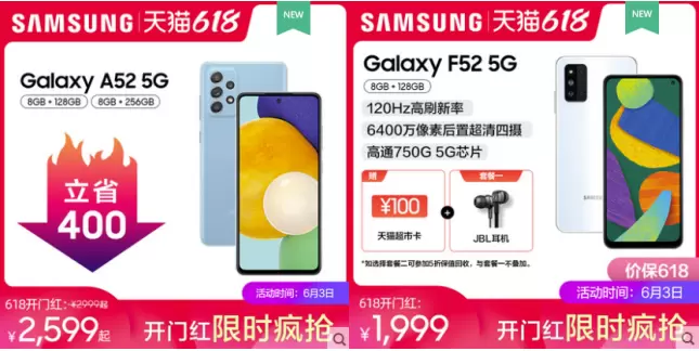 目前这两款机型在618年中活动中持续热销,其中原价2999元的三星Galaxy A52 5G立减400元仅售2599元起,三星Galaxy F52 5G的起售价则仅为1999元,活动期间购买这两款机型都能享受额外的官方福利,感兴趣的不要错过咯。