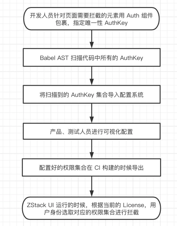基本原理清楚了,接下来就需要解决如何配置的问题。在研发体系中,最明晰用户需求的是产品经理,而最清楚产品使用逻辑的是测试人员。一套权限配置下来是否能够工作,不会阻断正常的工作流,需要产品和测试共同协作,这里面开发人员不参与任何配置工作,只是提供合适的工具将产品和测试的工作固化下来,这套配置系统称为ZStack-Assist。具体实现上分为数据采集、可视化配置系统、代码生成引擎、Debug 模式四大块。