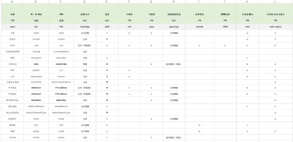既然操作的对象是表格,很自然的想到了利用钉钉自带的表格功能,钉钉表格支持多人协同编辑,也可以非常方便的锁定并回溯历史。为了维护构建表格所需的原始数据,我们创建了一个模板,称为字段配置表,如下图所示: