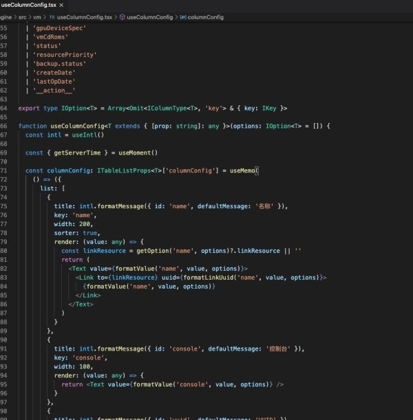 通过上图可以看出,生成的代码是非常工整的,由于是根据配置基于模板自动生成的,可以保证统一的风格。云主机的表格数据不仅存在于主列表中,还附属在物理机、云盘、网络、安全组等资源的详情页中,当资源创建需要选取云主机时,也会弹出云主机列表,在新版 UI 中,资源的所有列表页都共用了同一个组件,细心的读者如果观察 ZStack-UI 界面,会发现虽然云主机出现在很多地方,但其中显示的列数量、种类是不同的,这些都是通过上述的配置表来分开管控的,产品经理可以随心所欲的定制界面,而无需告知开发去修改。