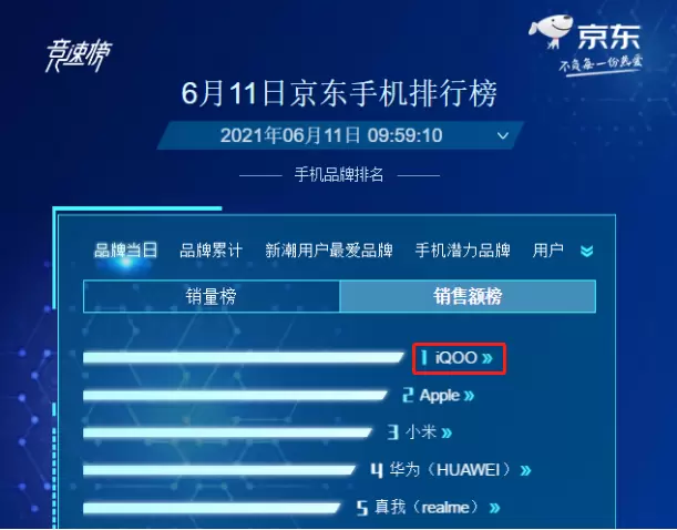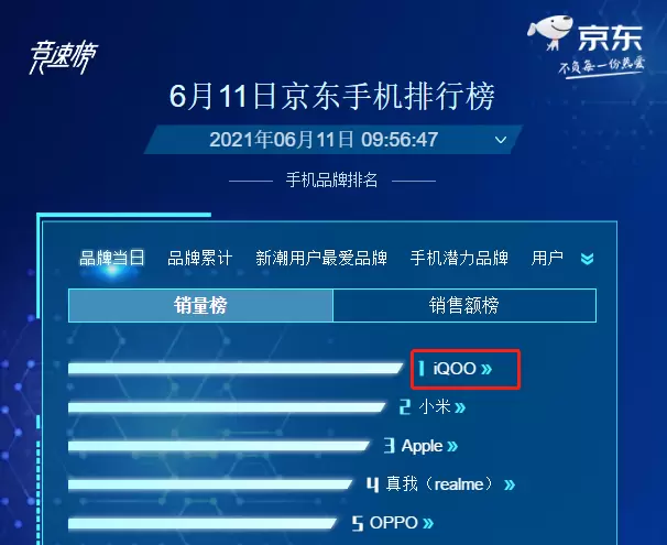 城头变幻大王旗。618开局,小米虽然一马当先拿下了互联网手机市场冠军宝座,但后劲明显不足。而首战排名第二的iQOO,在本文截稿前,已经实现了对小米的反超。从京东竞速榜来看,iQOO狂揽了手机品牌销量和销售额双冠军。可谓是一眨眼功夫,iQOO留给小米、苹果和华为等老将们的,就只有一个潇洒的背影了。