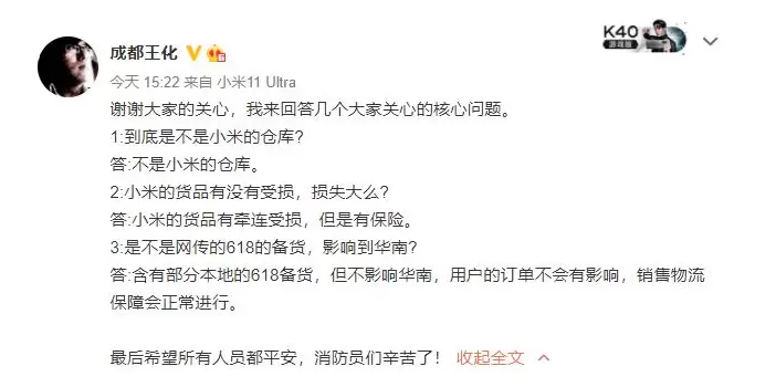 后面虽然小米公关总经理王化对此回应称:不是小米仓库,小米公司在仓库中有部分货品,货品有受到牵连,但有保险,用户的订单不会有影响,销售物流保障会正常进行。