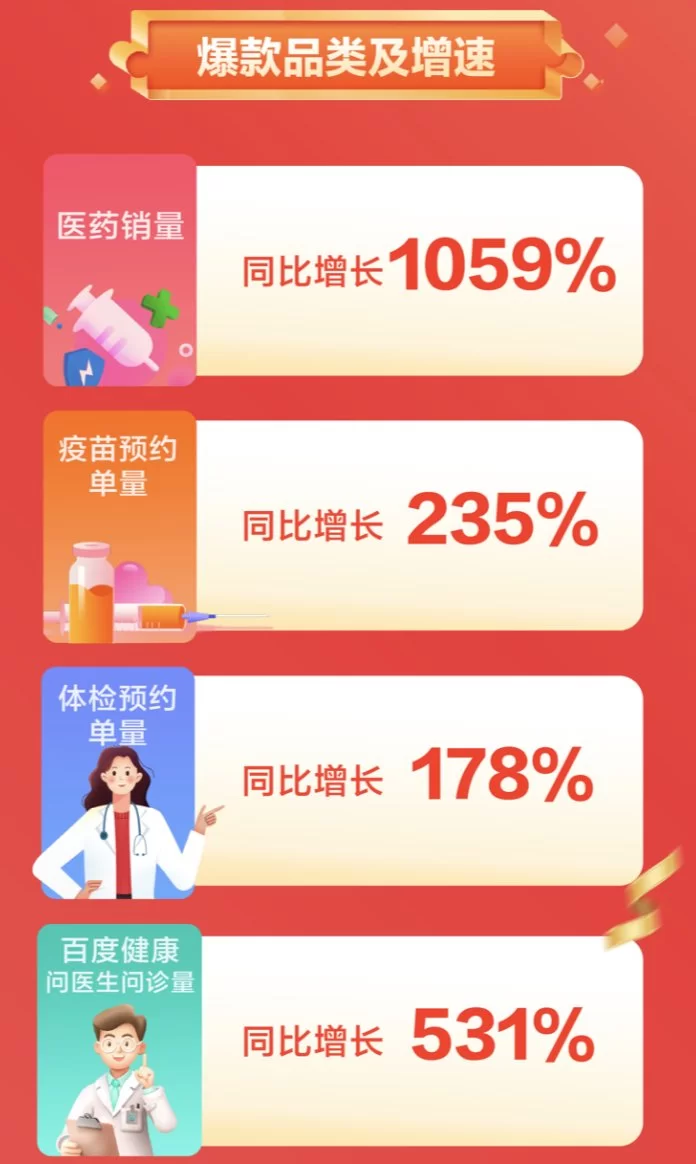 百度健康平台数据显示,人们需求爆款品类多集中在医药及健康防护品,其中医药销量同比增长1059%,疫苗预约单量同比增长235%,体检预约单量同比增长178%,用户日常健康消费不只停留在“治病”上,健康预防意识也在持续提升。