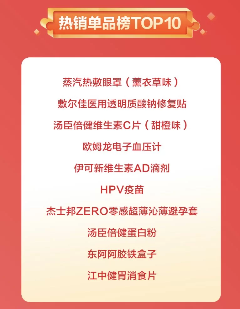 此外,百度健康还公布了“热销单品Top 10”榜单,汤臣倍健维生素C片(甜橙味)、汤臣倍健蛋白粉、东阿阿胶铁盒子、江中健胃消食片等滋补保健品是销量最高的品类,而蒸汽热敷眼罩(薰衣草味)、敷尔佳医用透明质酸钠修复贴等家庭常备用品也颇受消费者欢迎,“日常保健”、“安眠养颜”、“国产药妆”等特色健康产品已经成为健康消费新潮流。