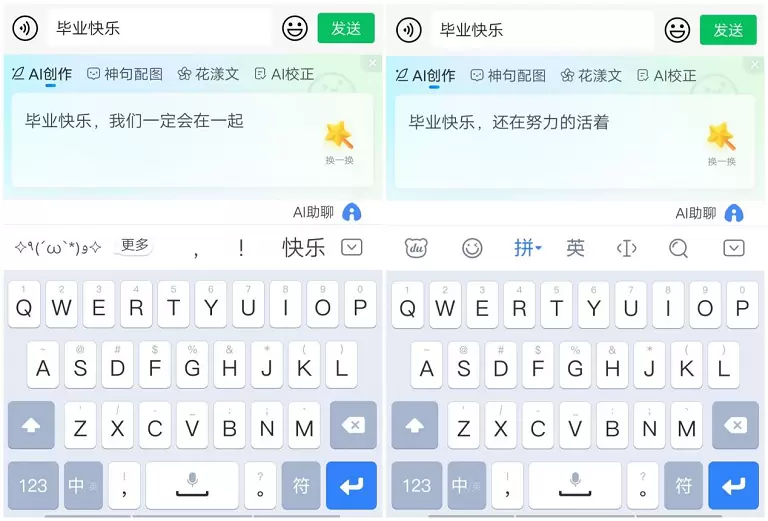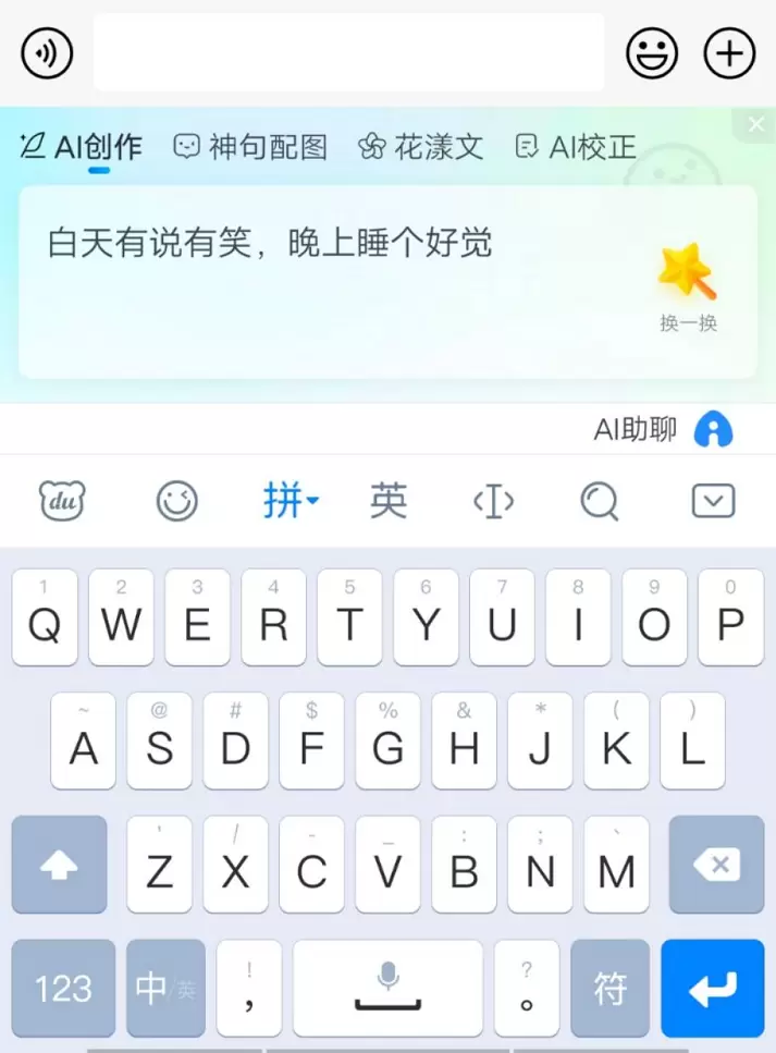 其中,百度输入法AI助聊的第一个能力AI创作可根据用户输入内容智能改写、扩写。通过AI创作,就可以帮你智能地创作出你可能要打出的语句,还可以点击“换一换”,进行随机更换,直到选出满意的语句。