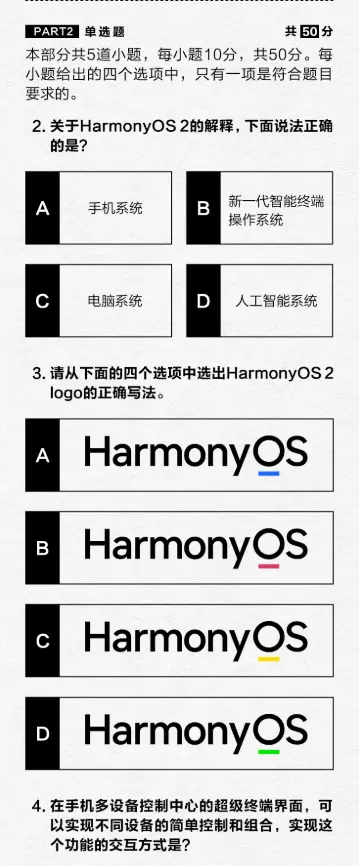 今日,华为终端官微发布了一张“2021年HarmonyOS 2全国统一考试”试卷,共有听力题、单选题、判断题三大类目,共计12道题目。