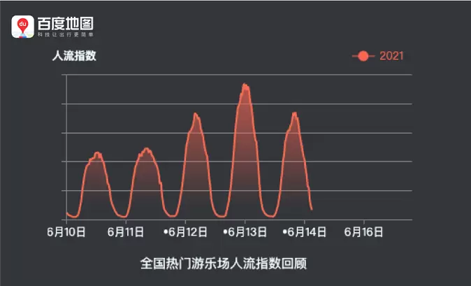 除景区外,游乐场成为端午出游的另一热门选择。数据显示,全国热门游乐场人流指数在6月13日14:30左右达到峰值,其中上海迪士尼度假区、北京欢乐谷、武汉欢乐谷、成都欢乐谷、常州中华恐龙园等地都是热门之选。