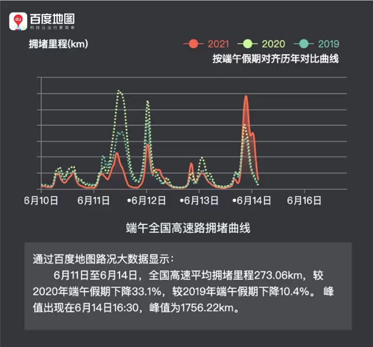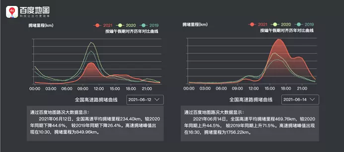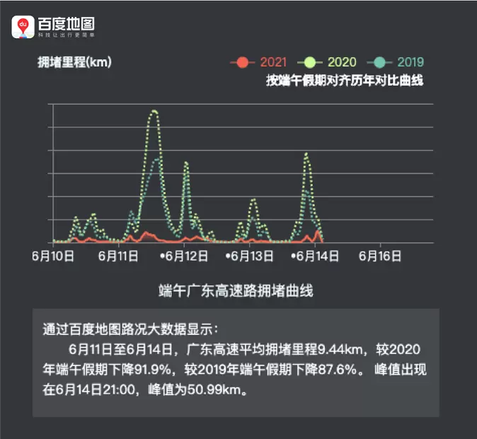 百度地图大数据:2021端午全国高速拥堵规模低于过去两年同期水平