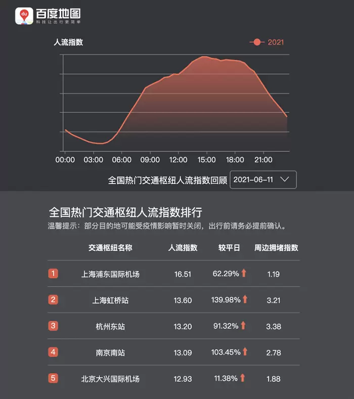 虽然是小长假,但公众出行需求不减。全国交通枢纽人流量较平时仍有明显上涨,人流指数峰值出现在6月11日14:30-15:00时段。其中,上海浦东国际机场、上海虹桥站、杭州东站、南京南站、北京大兴国际机场等热门交通枢纽的人流指数较高。