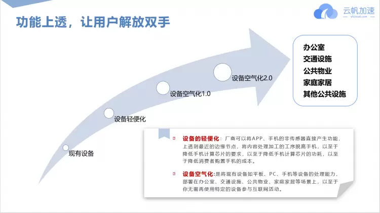 据云帆王保珍介绍,设备轻便化、设备空气化、是云帆在内部研讨会中“创造”的,我们觉得这个词很形象,很接地气以我们想要实现的设备空气化为例,是将现有设备如平板、PC、手机等设备的处理能力,部署在办公室、交通设施、公共物业、家庭家居等场景上,以至于你无需再使用特定的设备参与互联网活动。比如我们在超市结账,或者出行安检,已经实现了的面容识别。