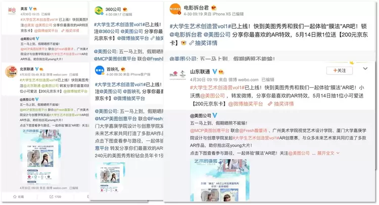 而在站外,以横向、纵向两条路径,进一步深度拓展活动影响力。#大学生艺术创造营vol1#活动横向在微博端美图官号发布引流图文内容,并链接活动同名话题,方便用户快速了解活动并参与,并联合56家品牌蓝V转发活动宣传微博,拓展宣发广度,进一步突破圈层影响力。纵向联合23家权威媒体,用深度行业级报道,拓宽传播纵深,提升活动口碑,以行业影响力反哺活动热度,助力深度破圈。