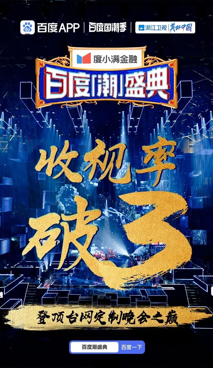 6月12日,由百度APP与浙江卫视联合推出的国内首台国潮骄傲主题盛典——《百度潮盛典》在浙江卫视播出并圆满收官。晚会期间,全网用户参与互动次数超115亿,百度潮盛典浙江卫视当晚收视率破3,创下台网定制晚会有史以来最高的收视率,丰收的收视与口碑无不彰显着百度国潮季IP在科技文化领域的强大号召力。