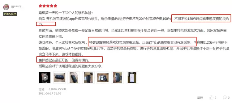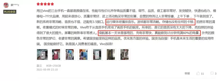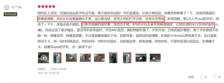 另外,通过用户@天***界 的评价来看,其手中的iQOO Neo5活力版显示效果突出,运行流畅不卡顿,颜值很高,发热控制得也比另一款手机好很多。