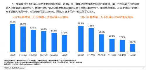 而在第三方输入法份额占比方面,搜狗输入法、讯飞输入法和百度输入法占据了整个市场份额的95%以上,形成了稳定的三足鼎立局面。报道重点分析、解读了输入法中的AI功能,其表示Z世代用户在AI功能使用率方面明显高于其他年龄段用户,使用率达到了79.5%,而21—25岁的用户占比就达到了72.8%,可见年轻人热衷于使用第三方输入法的AI功能。