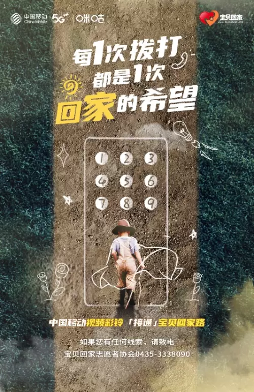 一直以来,“走失儿童”话题都受到社会的广泛关注,牵动着无数人的心。为了传递爱与希望,带动更多人参与到公益事业中,中国移动视频彩铃携手“宝贝回家”志愿者协会,推出承载着失踪儿童信息的公益短视频,以5G技术助力公益行动进一步传播,引发众多用户自发加入公益队伍,一起照亮宝贝回家路。