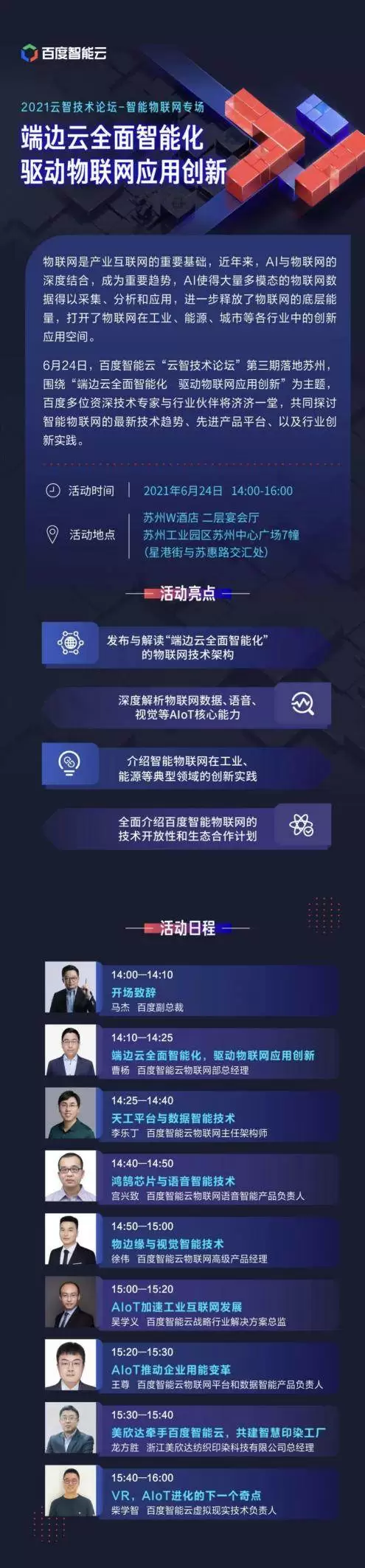 6月24日,百度智能云“云智技术论坛”智能物联网专场将落地苏州,围绕“端边云全面智能化 驱动物联网应用创新”,展示端边云全面智能化的天工AIoT平台。届时,百度多位资深技术专家与行业伙伴将集聚一堂,共同探讨智能物联网的最新技术趋势、先进产品平台、以及行业创新实践。以下四大亮点带你抢先了解此次会议内容。
