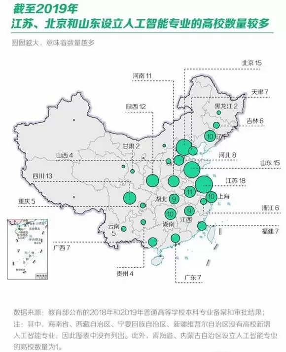从地域来看,江苏增设人工智能专业的高校数量最多,共有18所。北京(15所)和山东省(15所)的高校数量紧随其后。此外,四川省、陕西省、安徽省、河南省、上海市、辽宁省、湖南省的高校数量也均超过10所。