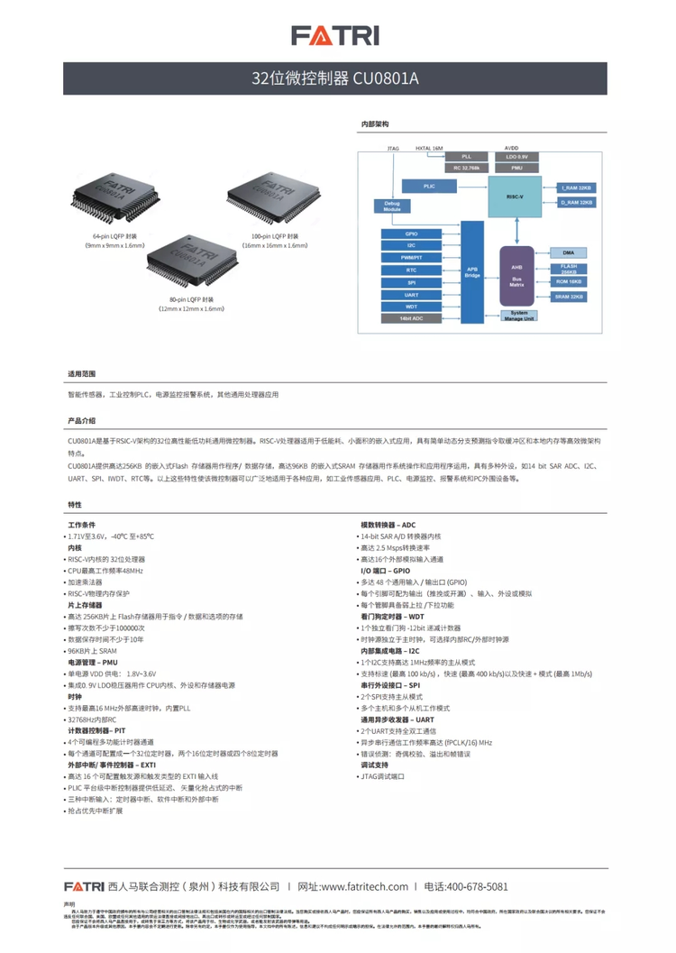 CU0801A提供高达256KB的嵌入式Flash 存储器用作程序/ 数据存储,高达96KB 的嵌入式SRAM 存储器用作系统操作和应用程序运用,具有多种外设,如14 bit SAR ADC、I2C、UART、SPI、IWDT、RTC等。