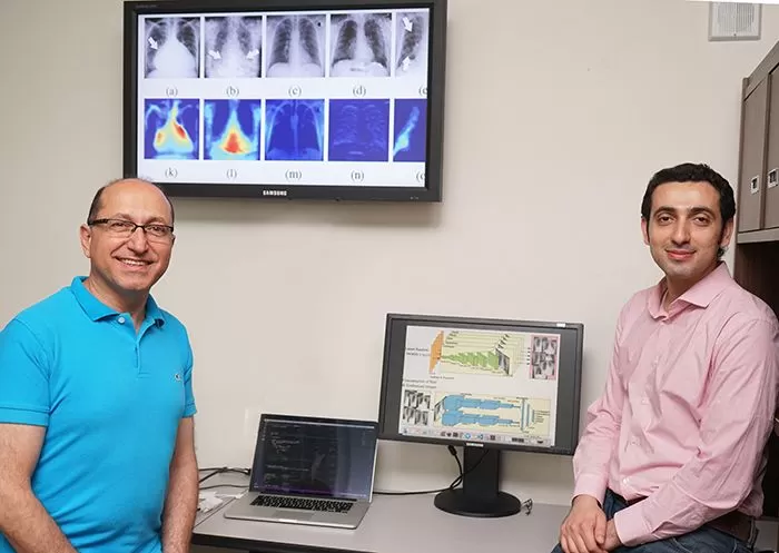 Shahrokh Valaee 教授和博士生 Hojjat Salehinejad 正在使用机器学习创建虚拟 X 射线胸透影像来训练 AI 系统识别罕见疾病。摄影:Jess MacInnis