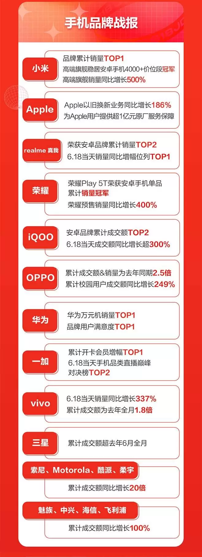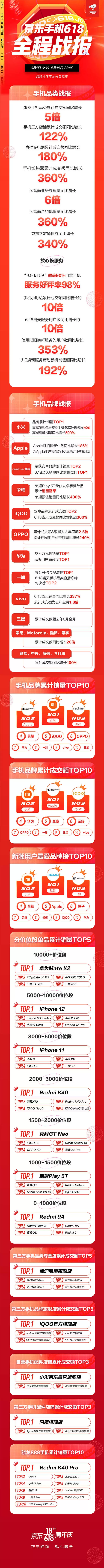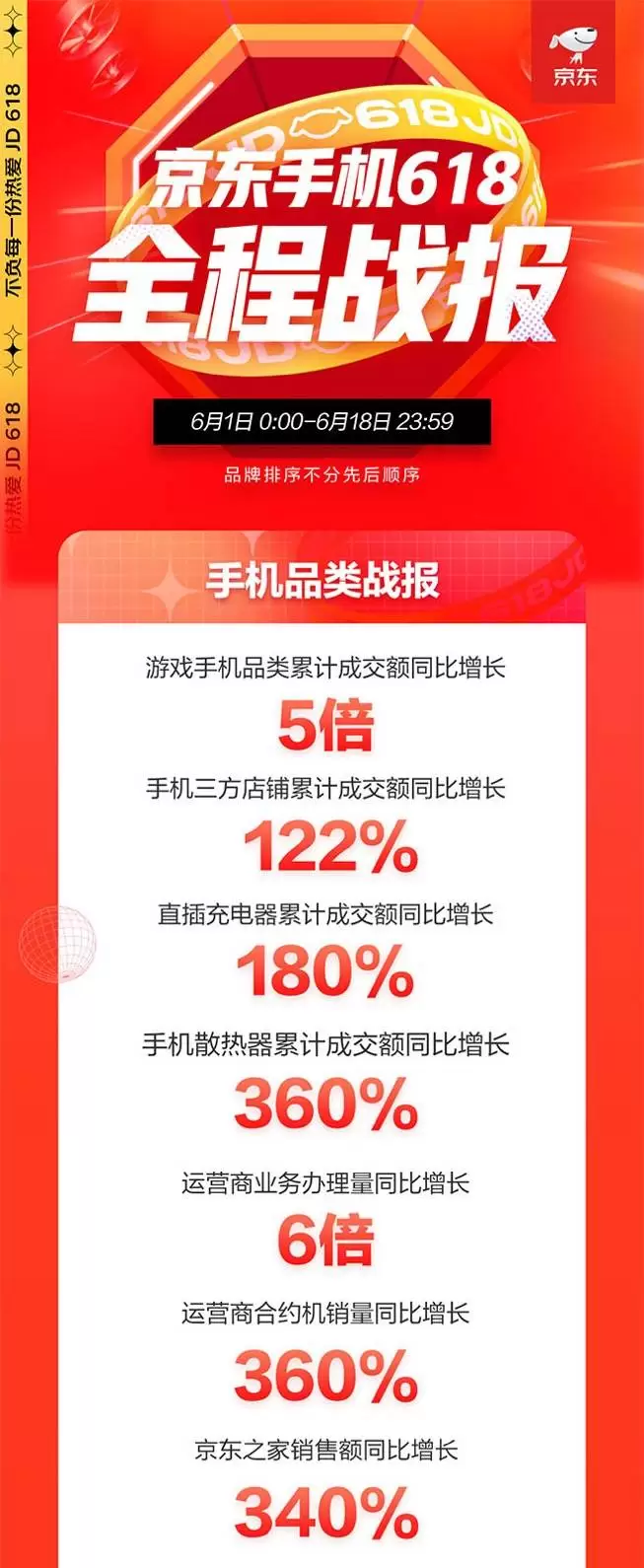 今年京东618手机全品类的持续热卖,井喷式增长再现消费活力。不负每一份热爱,京东将用正品好物和贴心服务,继续为用户带来极致消费体验,同时还将与品牌深度携手共建共创,帮助品牌伙伴降本增效,不断在京东收获新一轮的增长!