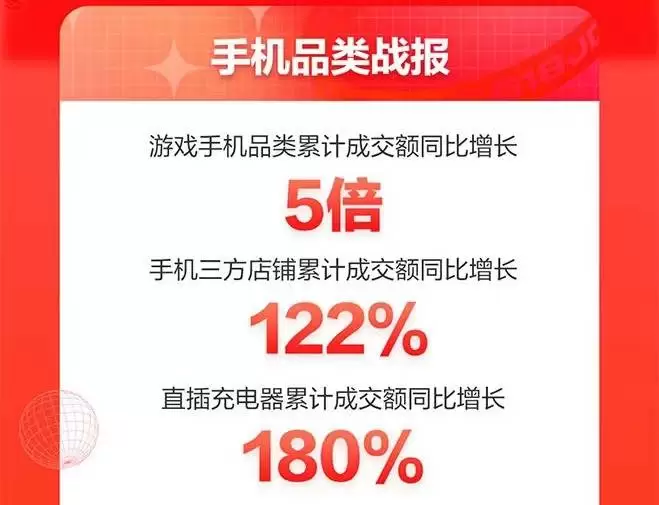 此外,消费者呈现多元的个性消费,也促使游戏手机、阅读手机等手机新品类持续受追捧,而作为手机关键“护法”手机配件也迎来加速增长。数据显示,游戏手机品类累计成交额同比增长5倍。