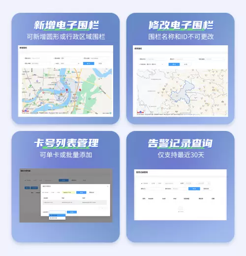 电子围栏支持客户自行设定物联卡终端活动的有效区域,当发生非法进入或移出所限定的区域范围时,客户将收到通知,从而及时采取管理措施。