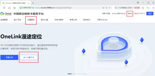 登录中国移动物联卡服务平台官网(https://ec.iot.10086.cn/ecology/homePage),从网站顶部菜单栏【位置服务】、或网站banner漫途定位的【进入位置平台】即可进入漫途位置服务平台!(账号登录后方可进入)