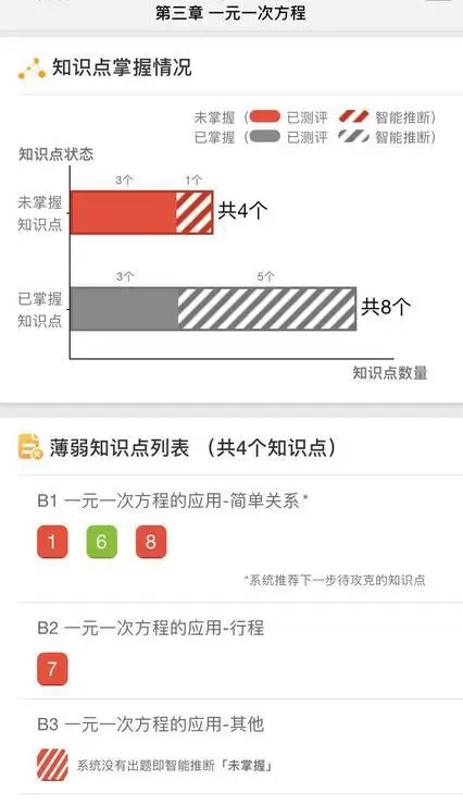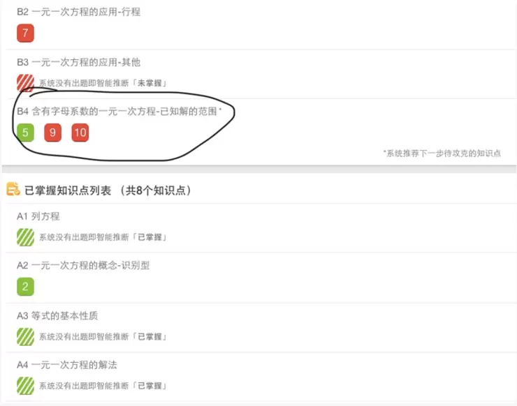 如图,在B4知识点中,刚开始第5 题做对了,但系统又推了第 9 题和第 10 题。这两道题答错了,让系统判断该知识点并没有掌握,第 5 题有可能是猜对的。