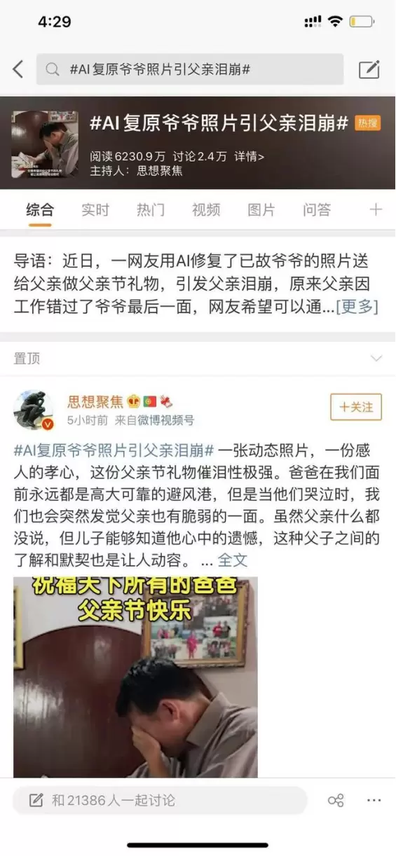 父亲节期间,“AI复原爷爷照片引父亲泪崩”的话题登上了微博热搜。一位开发者利用百度飞桨的AI技术,基于爷爷生前的照片,制作了逼真而生动的爷爷视频形象,并让爷爷和父亲实现了跨时空的“再相逢”和“再交流”。