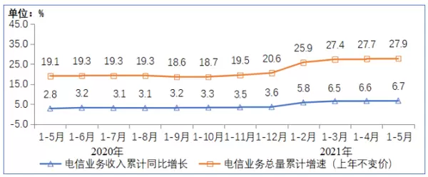 具体来说,2021年1-5月,三家基础电信企业完成固定数据及互联网业务收入为1059亿元,同比增长8.9%;完成移动数据及互联网业务收入2726亿元,同比增长2.7%。三家基础电信企业完成固定语音和移动语音业务收入97.4亿元和493亿元,同比分别下降4.7%和3.6%。