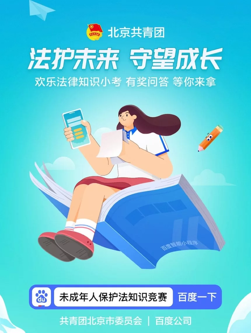 记者了解到,此次竞赛通过百度网络平台支持,不仅面向北京市全体青少年开展,也吸引了全网青少年、家长及关注青少年保护工作的社会公众积极参与法律知识学习。答题小程序快捷简便,界面青春活泼,符合青少年的用网习惯和审美偏好,广大青少年和网络用户,可以通过扫描二维码,或者通过百度APP搜索“法治知识竞赛”“未成年人保护法知识竞赛”“普法育未来学法助成长”等词组,链接到法治知识竞赛小程序。同时,百度借助小度音箱、小度智能屏等产品发出倡议,用音画等形式倡导全社会学法、守法、用法,关注未成年人健康成长,凝聚全社会保护未成年人的最大共识。