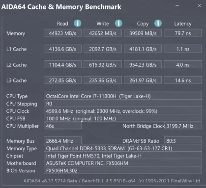 同时,由于三级缓存为24MB,酷睿i7-11800H对于内存读写速度的提升也较为明显。在AIDA64的内存性能测试项目里,同为DDR4-3200MHz的16GB内存,酷睿i7-11800H的读写速度分别为44923MB/s、42652MB/s,超过了读写速度为44007MB/s 、35380MB/s的AMD锐龙7 5800H。