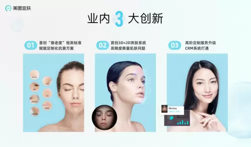 美图宜肤是一套基于人工智能,一站式服务美业客户的软硬件系统,可以为化妆品、医美等美业商家更科学、深度地分析每位顾客的肤况,以提供针对性的护理方案,能有效提升顾客的满意度,并通过长期记录顾客的皮肤变化,去更好地为顾客进行个性化服务。