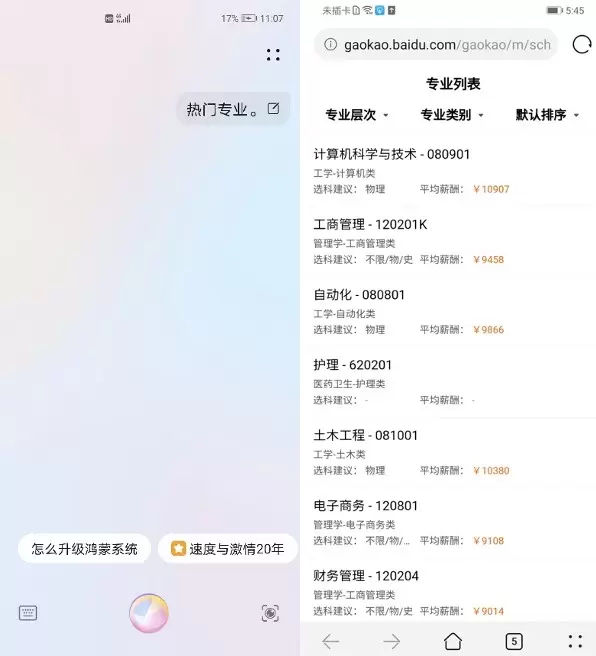 唤醒华为智慧助手小艺后说“热门专业”,即可快速获取专业列表信息,同时支持根据专业层次、专业类别、平均薪酬分类筛选。专业详情页内,专业简介、就业前景、开设院校、专业分数线、男女比例、专业对比、相似专业等相关信息也是一目了然。