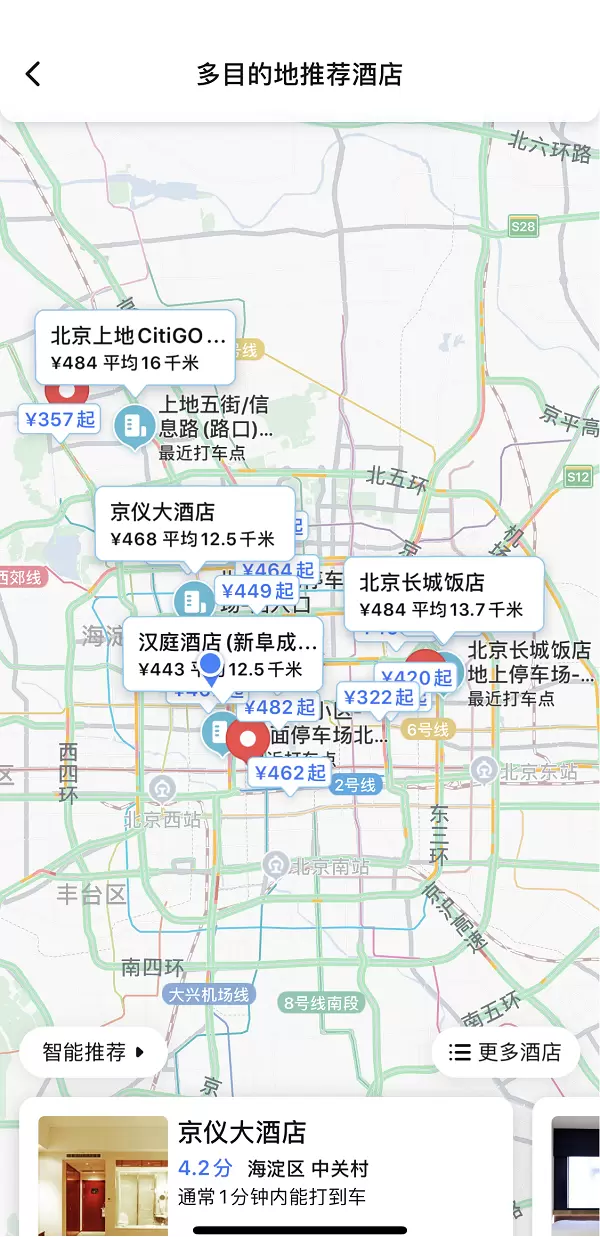 除了更精细化、个性化的筛选匹配外,用户还可点击页面下方酒店卡片中的“目的地”模块,灵活查看该酒店距离各目的地的行程路线和用时,获得更加精准的出行决策建议。