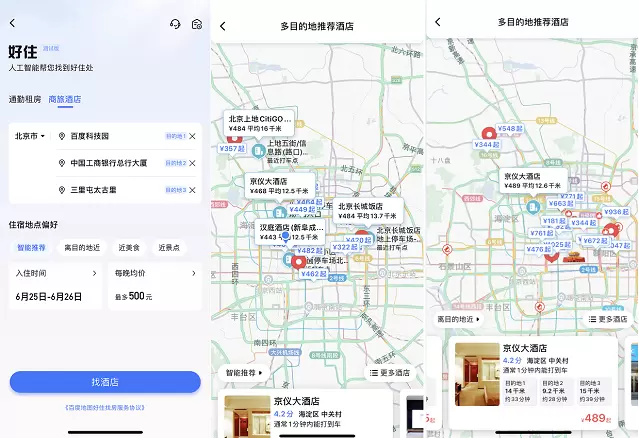 出差前,用户只需打开百度地图App,搜索“好住”关键词,选择“商旅酒店”进入该功能页面,填写此次出行的多个目的地点、入住日期、价格预算等筛选条件,点击“找酒店”即可一键查看住宿方案推荐。此外,好住商旅酒店功能还支持住宿地点偏好选择,并进行丰富的人性化展示。比如,用户在结束商务活动后,想去当地的网红餐厅打卡,就可以在地点偏好中选择“近美食”,从而更快、更准地选到心仪酒店。