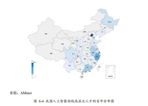 其中,京津冀地区(主要是北京市)在AI领域的高层次人才数量最多。长三角地区也有较多的 AI 高层次人才分布。相比之下,内陆地区领域高层次人才较为缺乏。