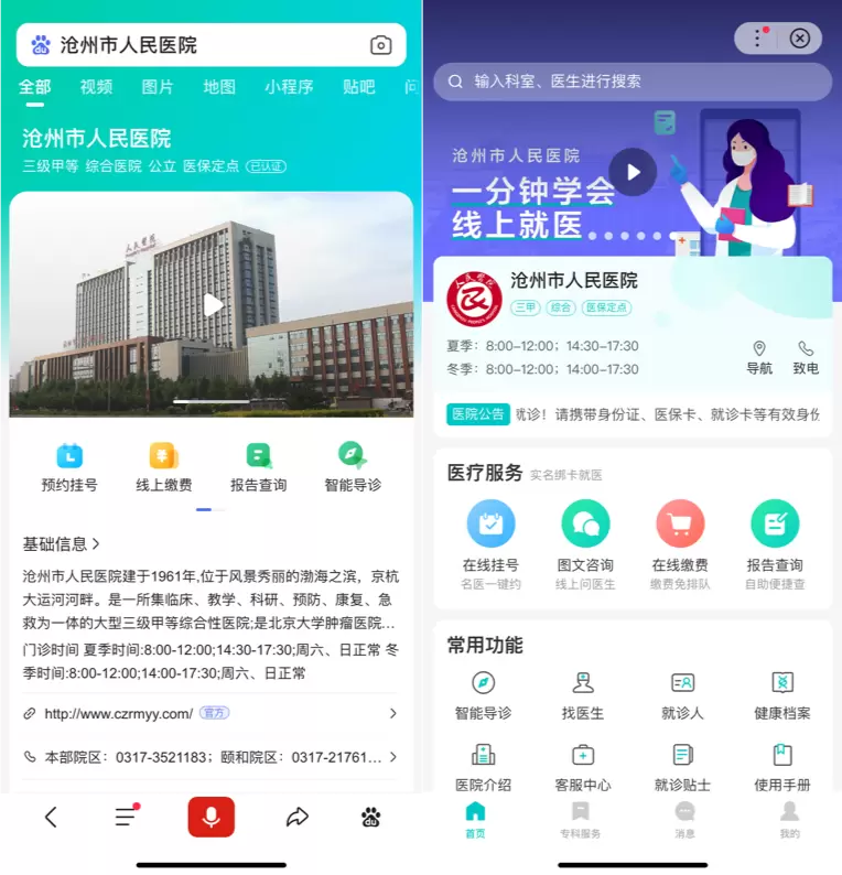 目前,用户通过百度APP搜索“沧州市人民医院”,即可直接进入沧州市人民医院互联网医院小程序,享受完整的健康服务体验。