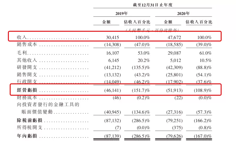 从招股书中可以看出,2019年至2020年,公司的收入从3041.5万元增加至4767.2万元,增幅高达50%,但经营亏损也不断增加,从4614.1万元增加至5191.3万元。