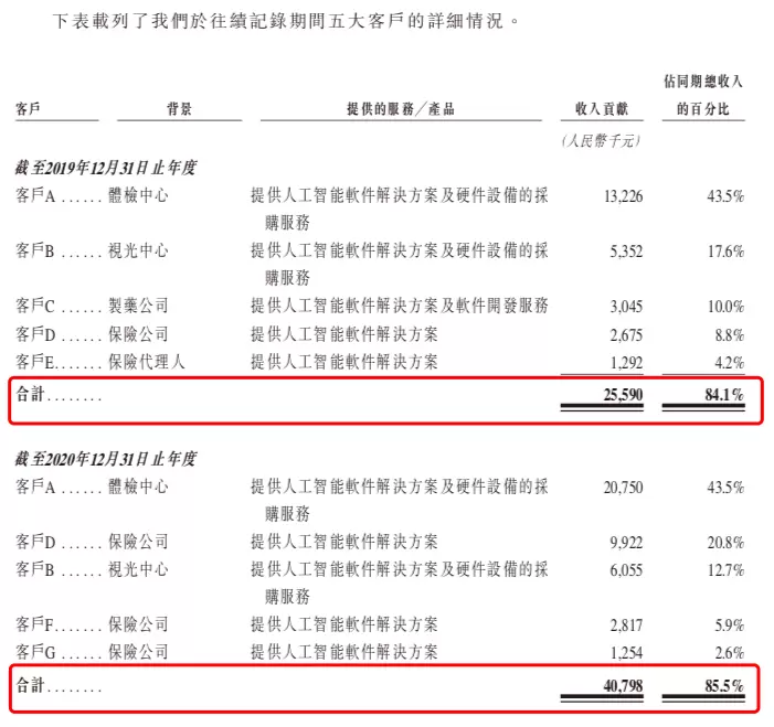 其中,公司最大客户是一家体检中心,在2019至2020年的收入为人民币1322.6万元及人民币2075万元,分别占公司同期收入的43.5%及 43.5%。