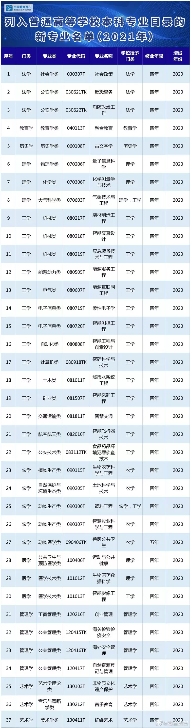 ▲列入普通高等学校本科专业目录的新专业名单(2021 年)| 图源:教育部新闻办公室