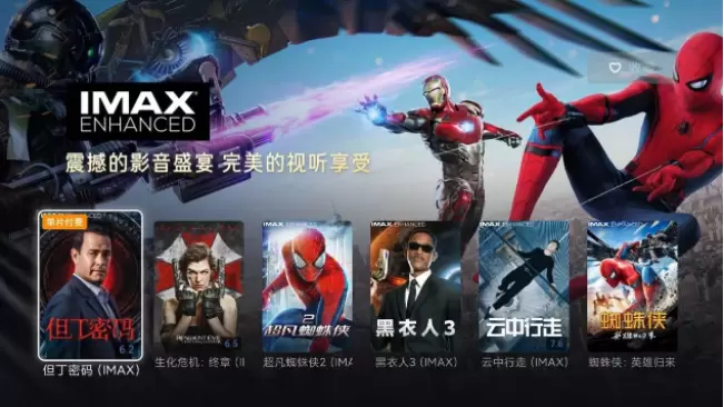 在中国市场,IMAX Enhanced 与腾讯视频、爱奇艺两大国内流媒体巨头合作上线了 IMAX Enhanced 内容专区。目前的片单中既有《超凡蜘蛛侠2》、《生化危机:终章》、《但丁密码》、《黑衣人3》等国际大片,也有《八佰》、《紧急救援》、《拆弹专家2》、《刺杀小说家》和《新神榜:哪吒重生》等国产巨制。拥有 IMAX Enhanced 认证设备的用户只需打开 IMAX Enhanced 专区即可挑选他们喜欢的电影重温在 IMAX 影院经历过的沉浸式音画体验。