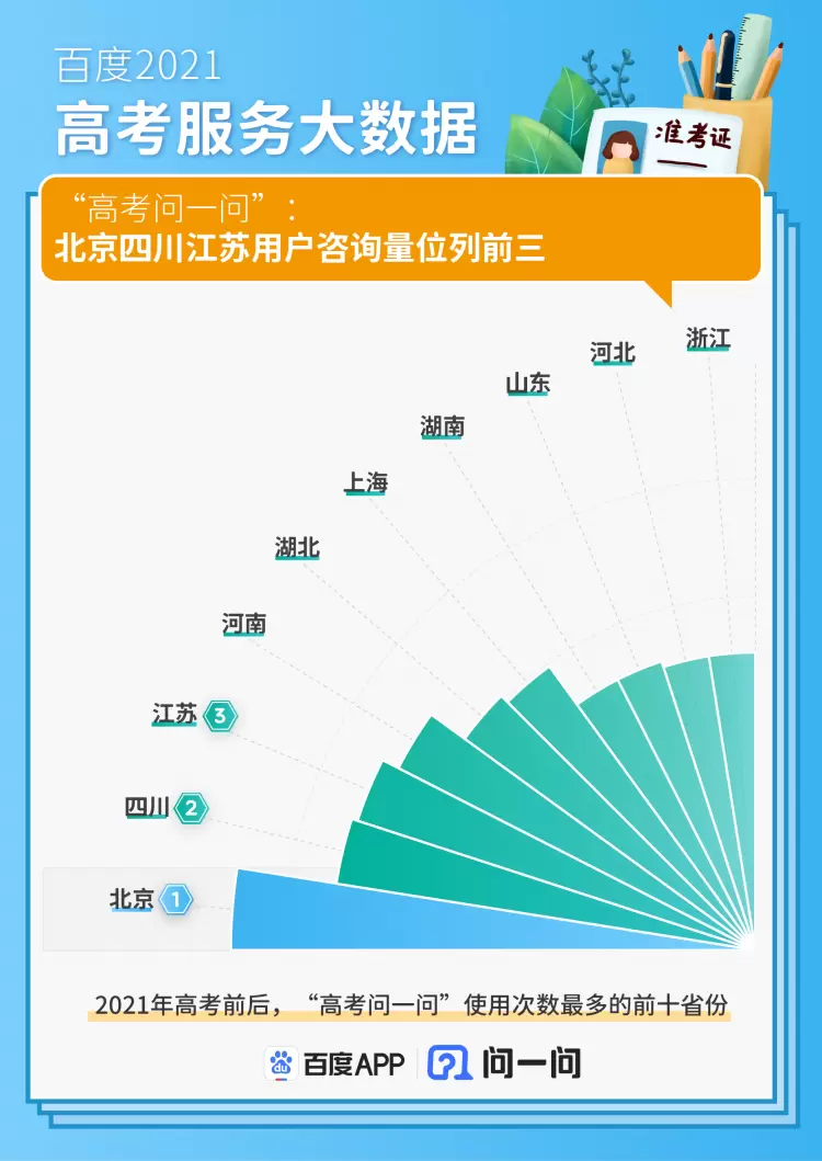 百度今年新推出“高考问一问”, 邀请1400余所高校招生办、3000多位高校名师、500多位专业心理咨询师、8000多位重点高校学长入驻,为考生和家长提供一对一的免费咨询服务,更有关晓彤、罗翔、魏坤琳和陶勇的名人大咖加入,与考生实时活动。数据显示,5月11日至6月27日,百度“高考问一问”单日最高服务高考咨询400万轮次,累计为考生及家长提供2400万轮次一对一高考专业咨询服务。其中,北京、四川、江苏、河南、湖北、上海、湖南、山东、河北、浙江等考生人数众多的“高考大省”是使用次数最多的地区。