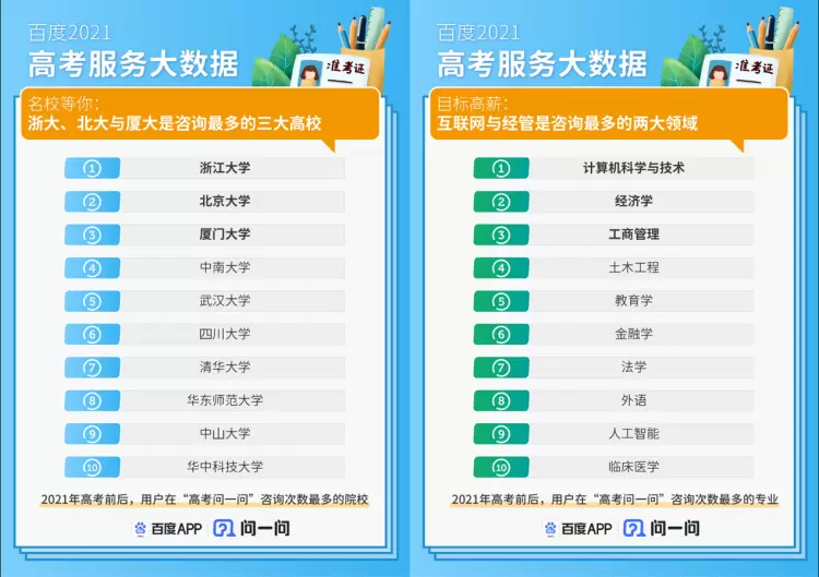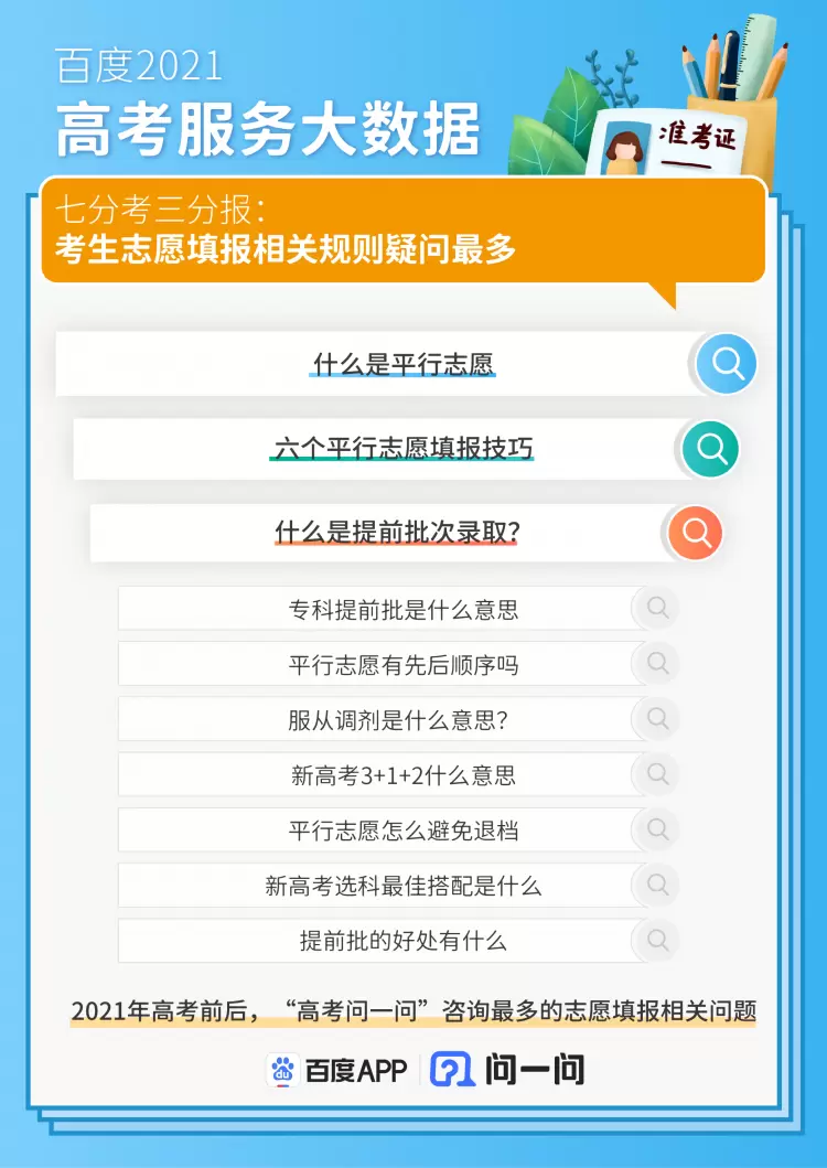 除了高考相关的服务数据,百度还通过搜索、服务数据洞察高考期间最受考生关注的内容。专业及大学作为考生未来发展的重要因素,也是每年考后阶段的“热门话题”。一直以来,大家都在为志愿填报优先考虑学校还是优先考虑专业争执不休,“高考问一问”通过一对一咨询的方式,让高校招生办、专家等“过来人”结合考生自身情况和个性化需求,提供择校、选专业等相关信息参考。“高考问一问”平台数据显示,“什么是平行志愿?”“六个平行志愿填报技巧”“什么是提前批次录取?”等是用户咨询最多的志愿填报相关问题。